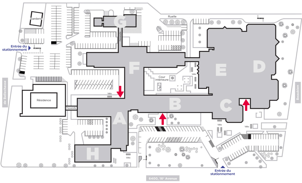 Les entrées pour l’évènement sont indiquées par les flèches rouges ci-dessous.